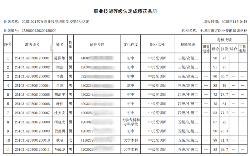 2025年第9批次中式烹调师技能等级认定考试成绩公示