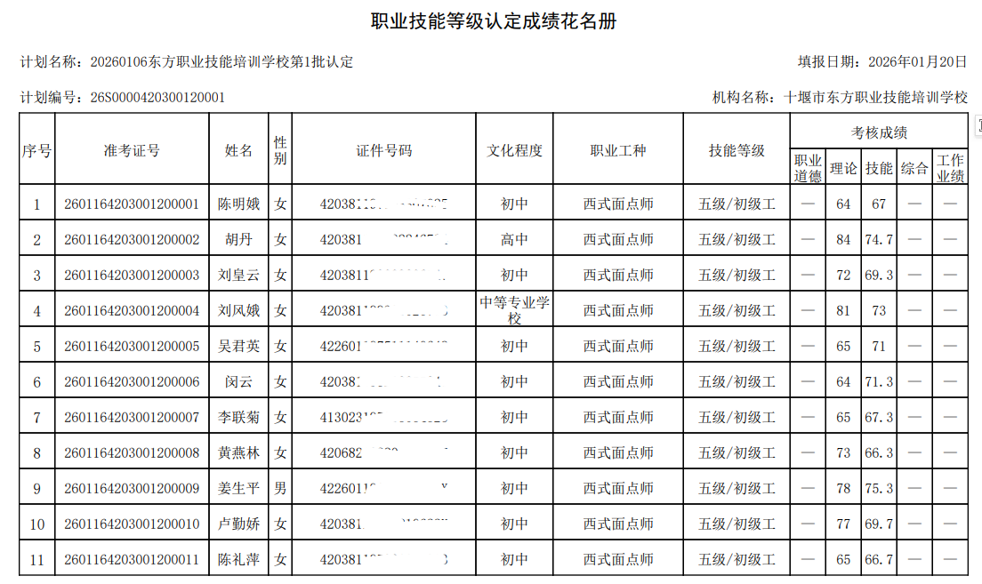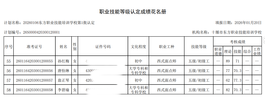 2026年第1批次西式面点师技能等级认定考试成绩公示