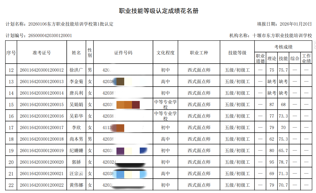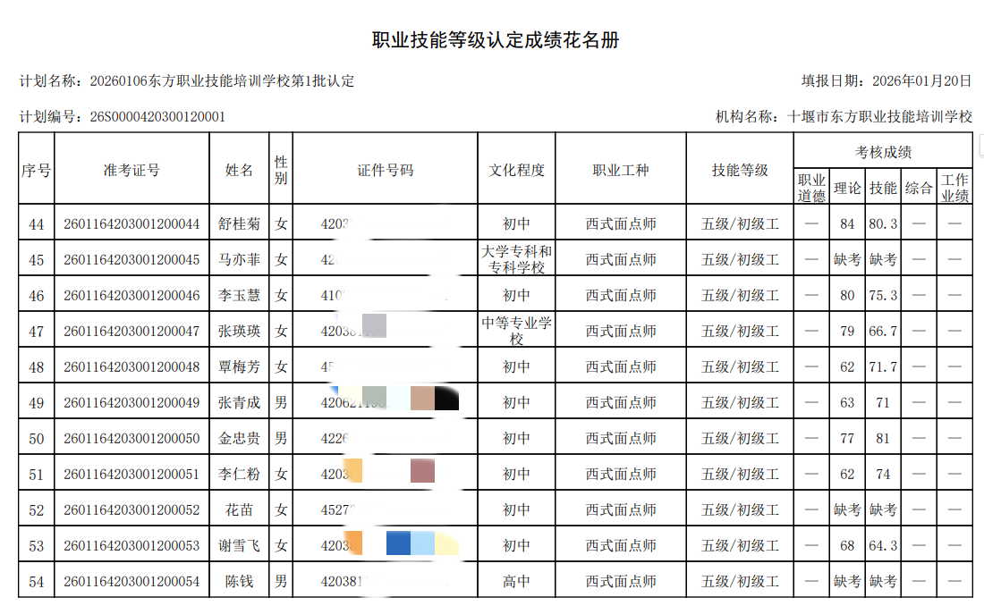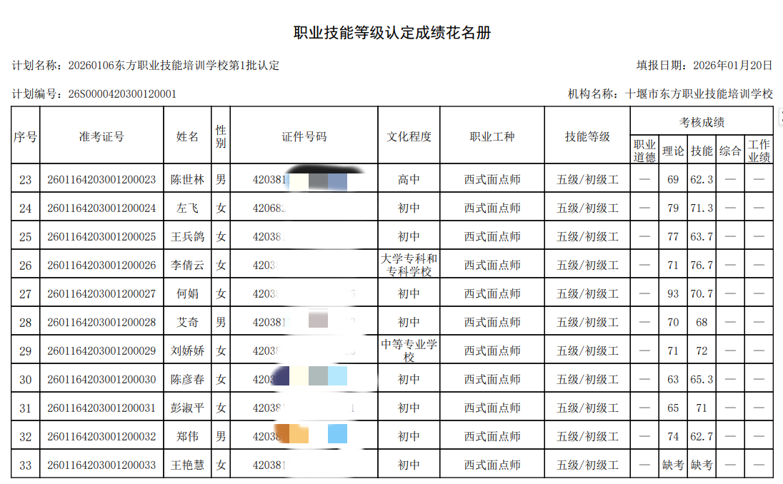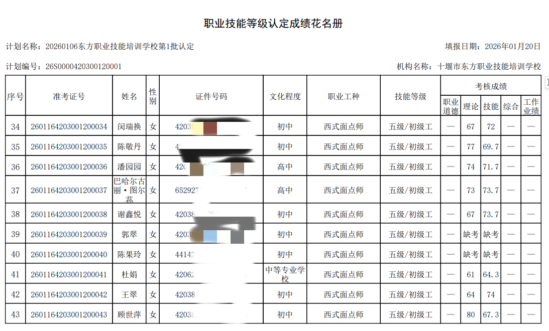 我校于2026年12月30日组织2026年第1批次西式面点师技能等级认定考试,全部为西式面点师.报名人数58人,考试人数50人。8人缺考,成绩名册特此公示。如有疑问,请于10个工作日内提出异议,名册如下