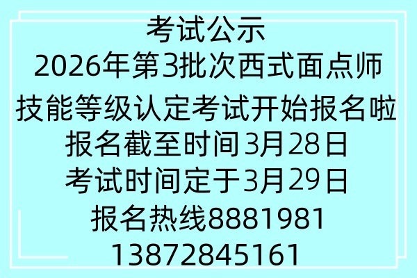 十堰市东方职业技能培训学校2026年第3批次西式面点师初级工、中级工、高级工技能等级认定考试现在开始报名啦!有需要的人士可前来报名,报名截至到3月28日,考试日期定于3月29日开考
