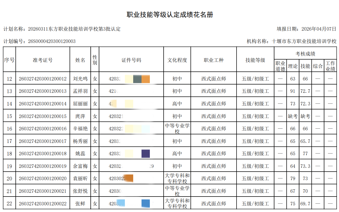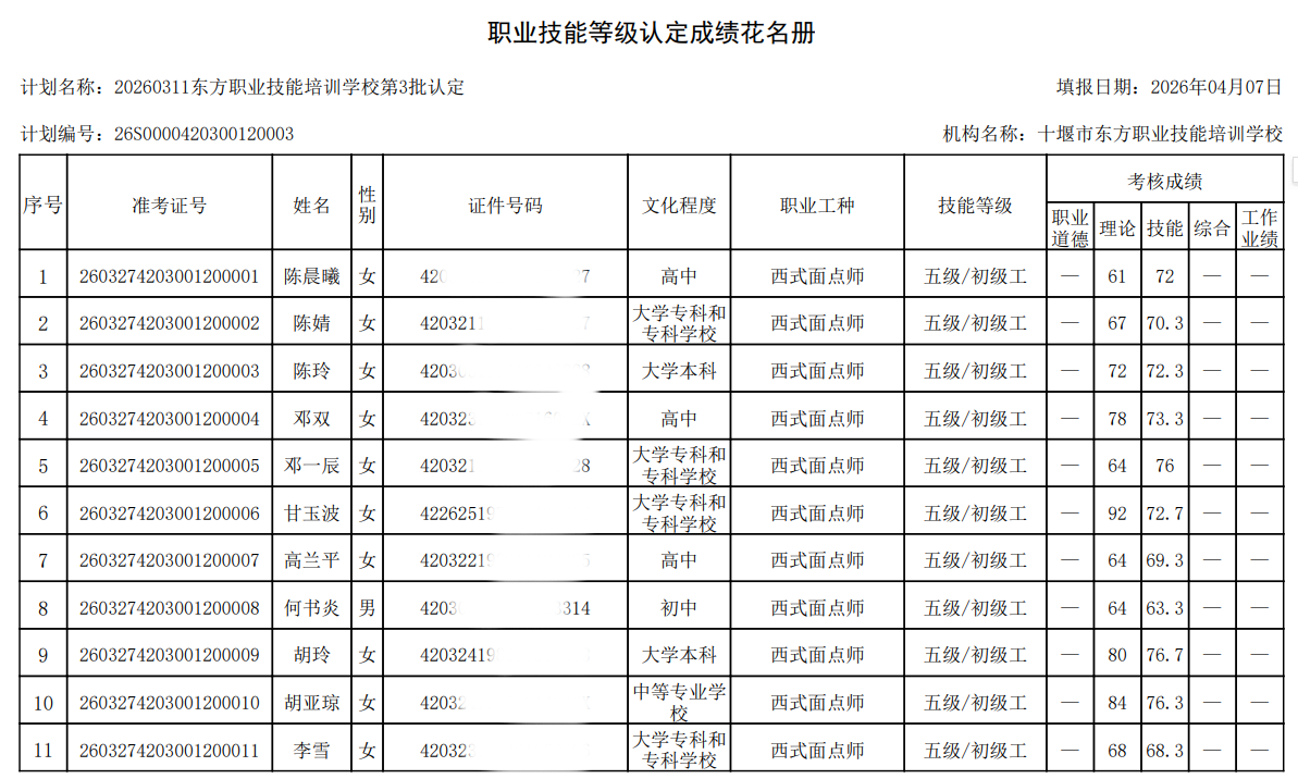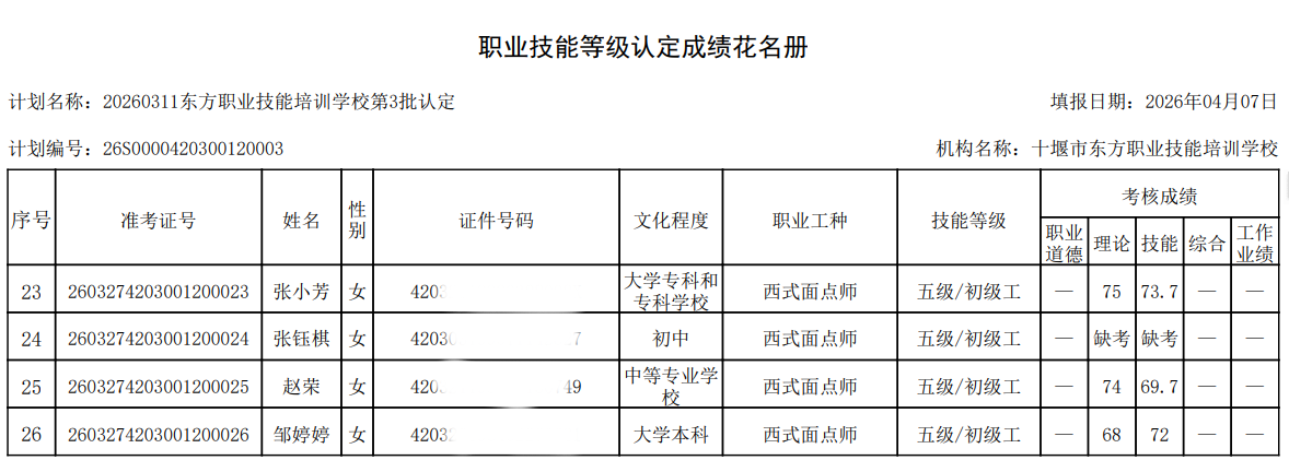 2026年第3批次西式面点师技能等级认定考试成绩公示