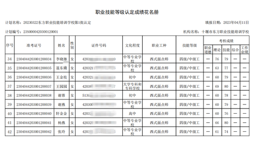 我校于2023年4月4日组织2023年第1批次西式面点师技能等级认定考试——共42人,全部为西式面点师四级,报名人数42人,考试40人,缺考2人。成绩名册特此公示。如有疑问,请于10个工作日内提出异议,名册如下: