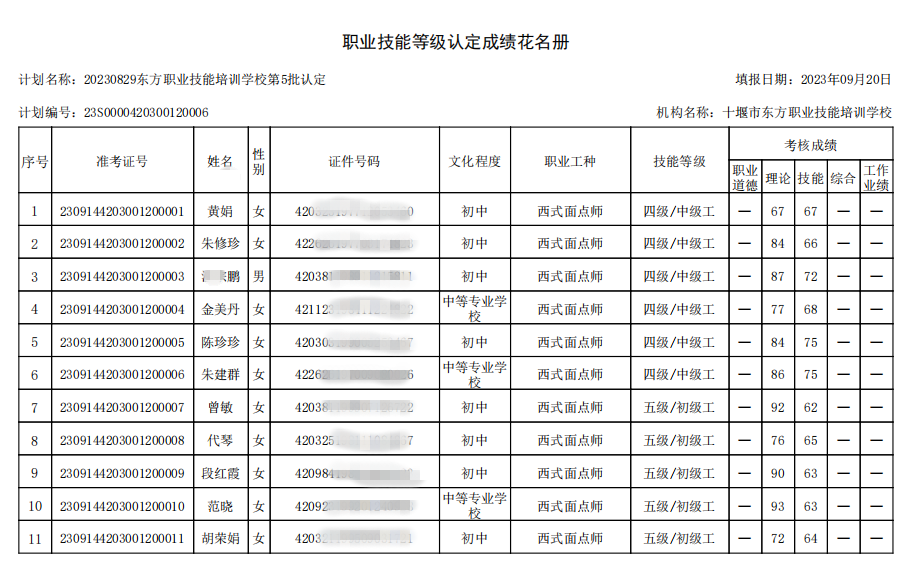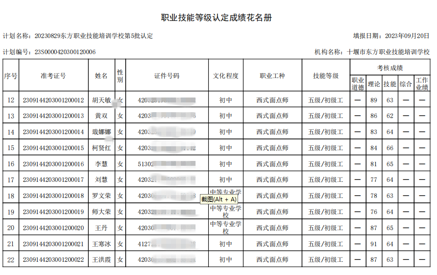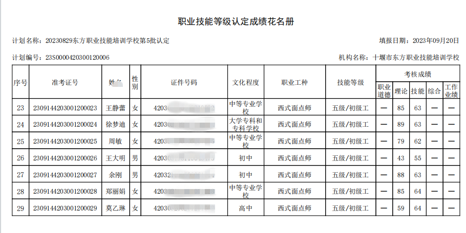 2023年第5批次西式面点师技能等级认定考试成绩公示