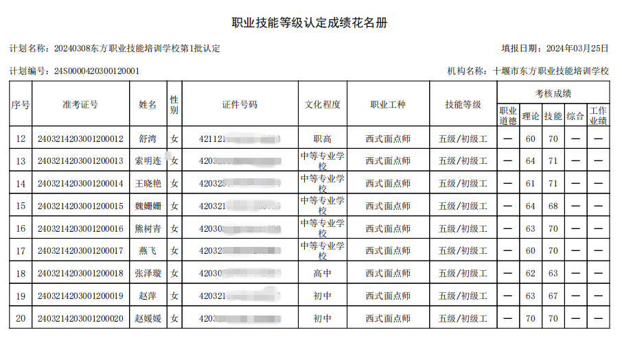 我校于2024年3月21日组织2024年第1批次西式面点师技能等级认定考试——共20人,全部为西式面点师五级.报名人数20人,考试人数20人,通过18人.无人员缺考。成绩名册特此公示。如有疑问,请于10个工作日内提出异议,名册如下