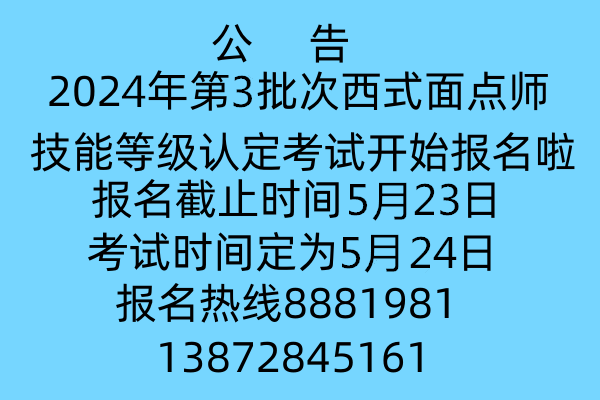 十堰市东方职业技能培训学校2024年第3批次西式面点师高级工(三级),技能等级认定考试现在开始报名啦!有需要的人士可前来报名,报名截至到5月23日,