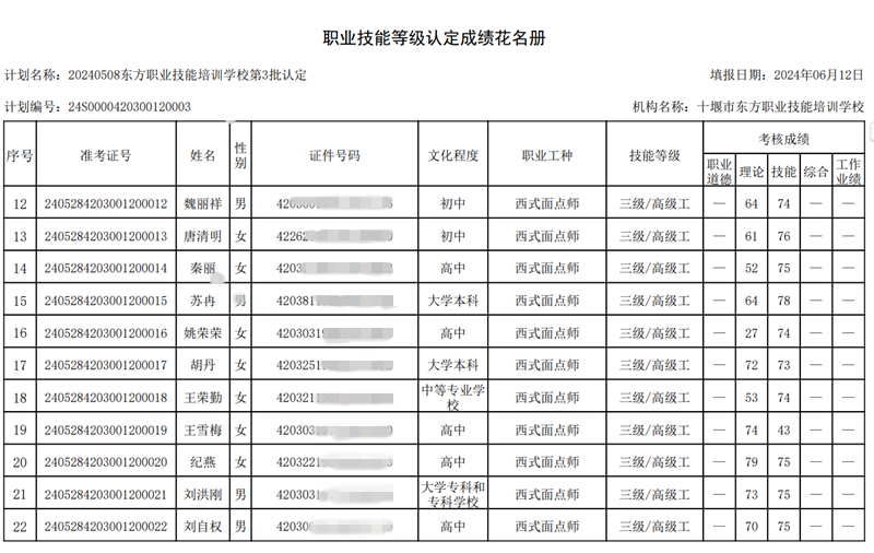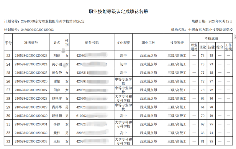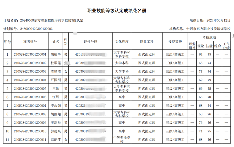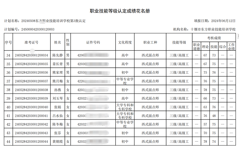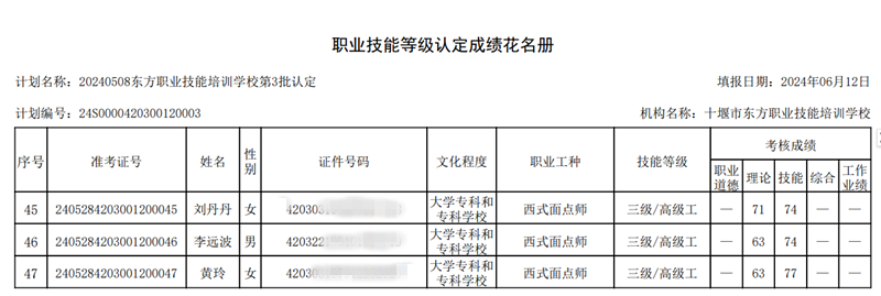 我校于2024年5月28日组织2024年第3批次西式面点师技能等级认定考试——共47人,全部为西式面点师三级(高级工).报名人数47人,考试人数47人,通过38人.无人员缺考。成绩名册特此公示。如有疑问,请于10个工作日内提出异议,名册如下