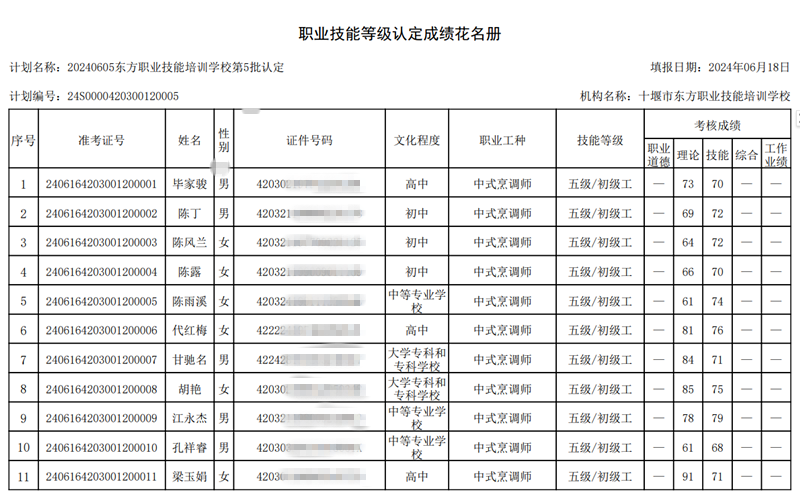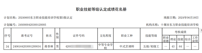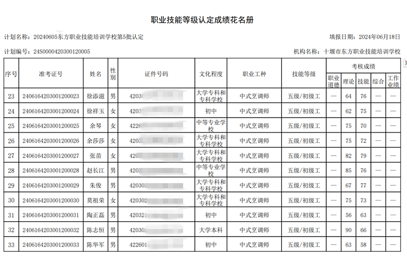 我校于2024年6月16日组织2024年第5批次中式烹调师技能等级认定考试——共34人,全部为中式烹调师五级.报名人数34人,考试人数34人,通过31人.无人员缺考。成绩名册特此公示。如有疑问,请于10个工作日内提出异议,名册如下