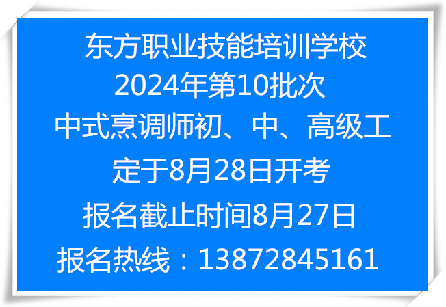 十堰市东方职业技能培训学校2024年第10批次中式烹调师初级工(五级)、中级工(四级)、高级工(三级)技能等级认定考试现在开始报名啦!有需要的人士可前来报名,报名截至到8月27日,考试日期定于8月28日!