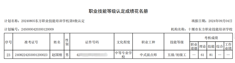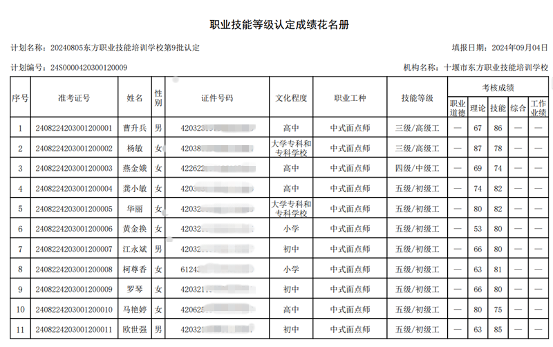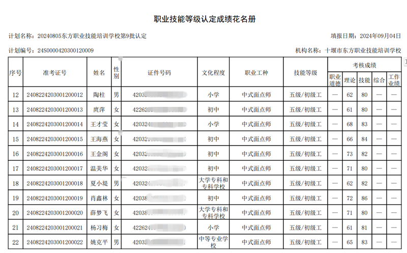 我校于2024年8月22日组织2024年第9批次中式面点师技能等级认定考试——共23人,全部为中式面点师初级工(五级)20人。中级工(四级)1人.高级工(三级)2人。报名人数23人,考试人数23人,通过22人.无人员缺考。成绩名册特此公示。如有疑问,请于10个工作日内提出异议,名册如下