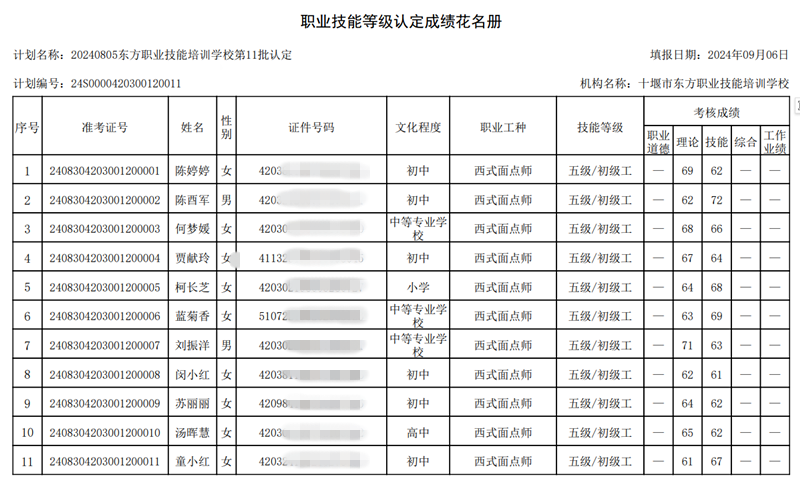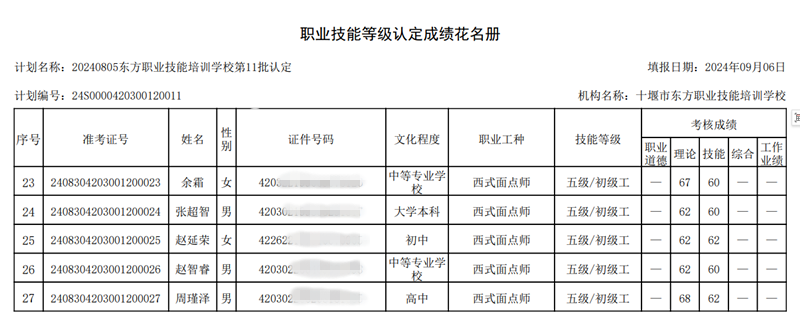 2024年第11批次西式面点师技能等级认定考试成绩公示