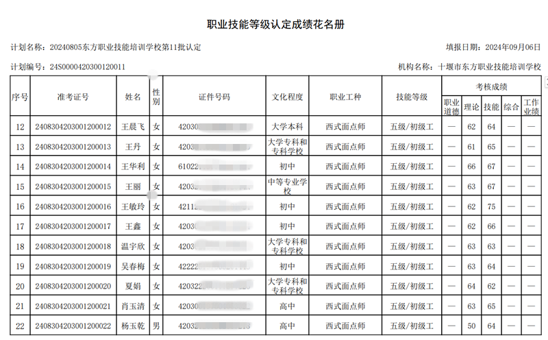 我校于2024年8月30日组织了第11批次西式面点师技能等级认定考试共27人,全部为西式面点师五级(初级工),无缺考人员,考试通过人数26人,现将考试成绩予以公示,如有疑问,请于10个工作日内提出异议,名册如下: