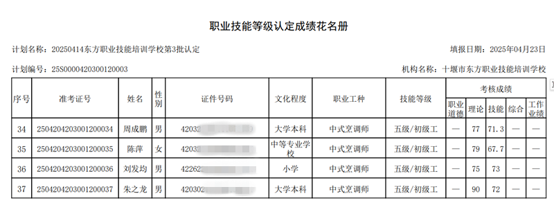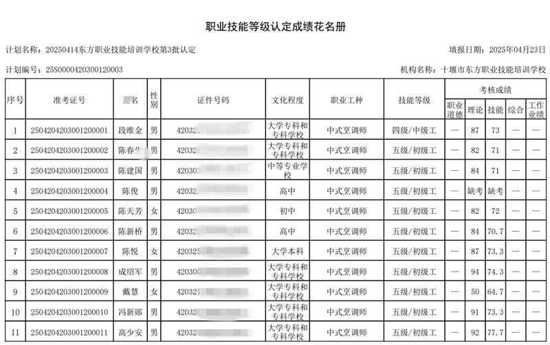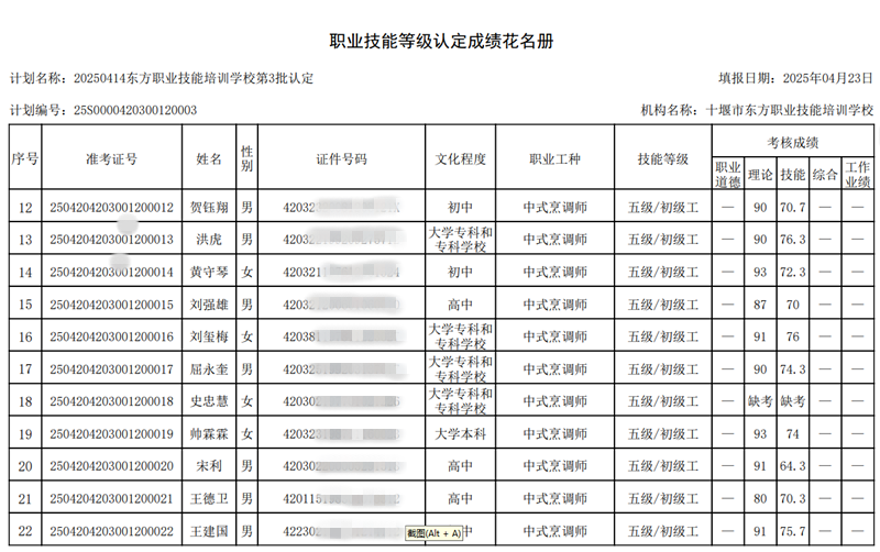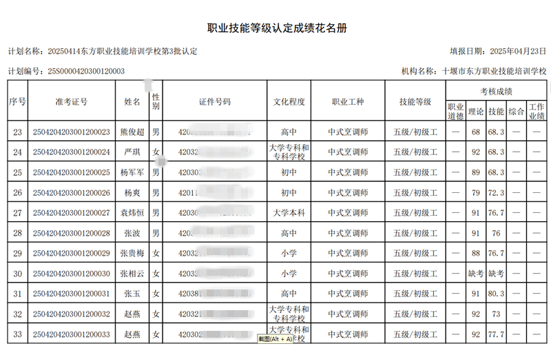 我校于2025年4月20日组织2025年第3批次中式烹调师技能等级认定考试——共37人,全部为中式烹调师初级工(五级).中级工(四级)报名人数37人,考试人数34人,通过33人.3人缺考,1人不及格。成绩名册特此公示。如有疑问,请于10个工作日内提出异议,名册如下