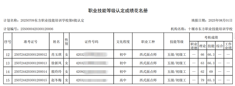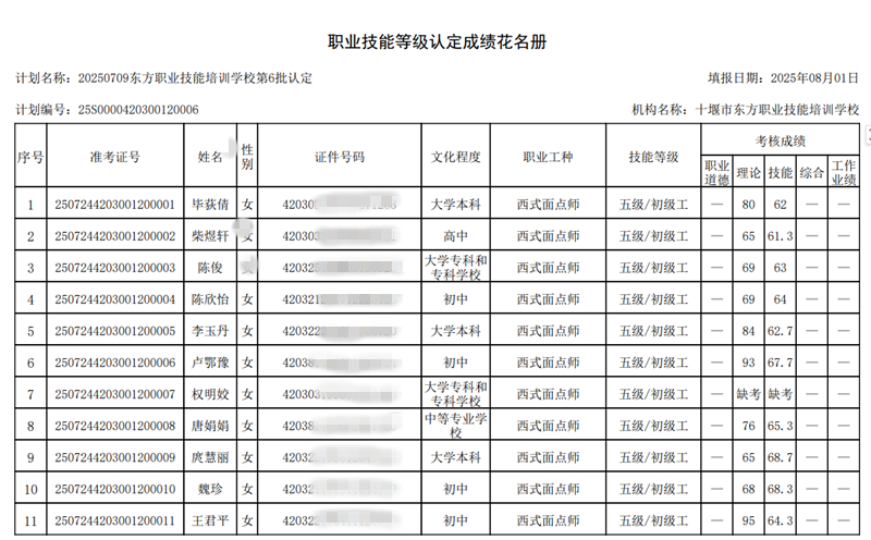 我校于2025年7月24日组织2025年第6批次西式面点师技能等级认定考试——共15人,全部为西式面点师五级(初级工).报名人数15人,考试人数14人,通过14人.缺考人数1人.成绩名册特此公示。如有疑问,请于10个工作日内提出异议,名册如下